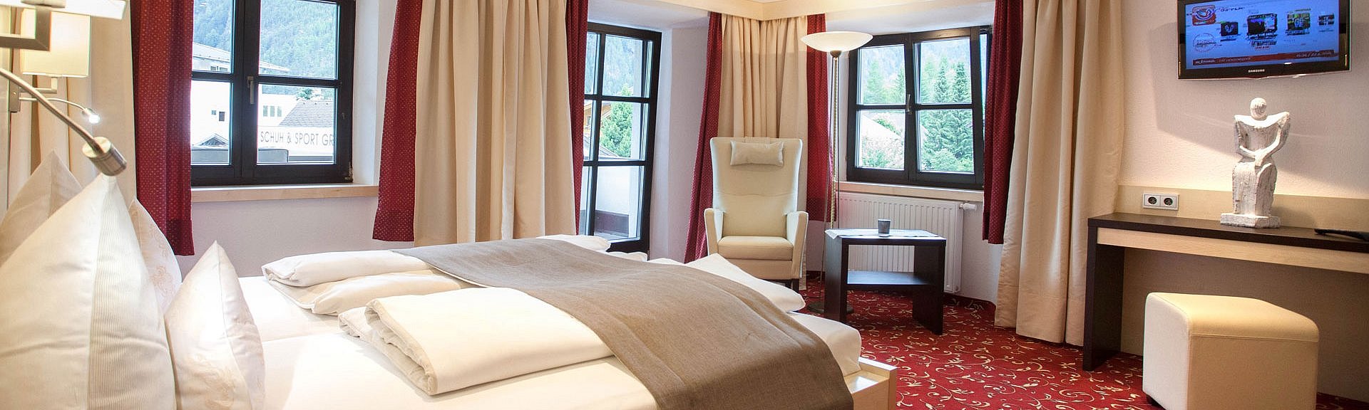 Cozy double room focused on nature, mountains, and comfort. Features real wood, stylish furniture, partially open bathroom with shower, WC, hairdryer, bathrobes, sauna & bath towels, safe, flat-screen TV, radio, telephone, and balcony.