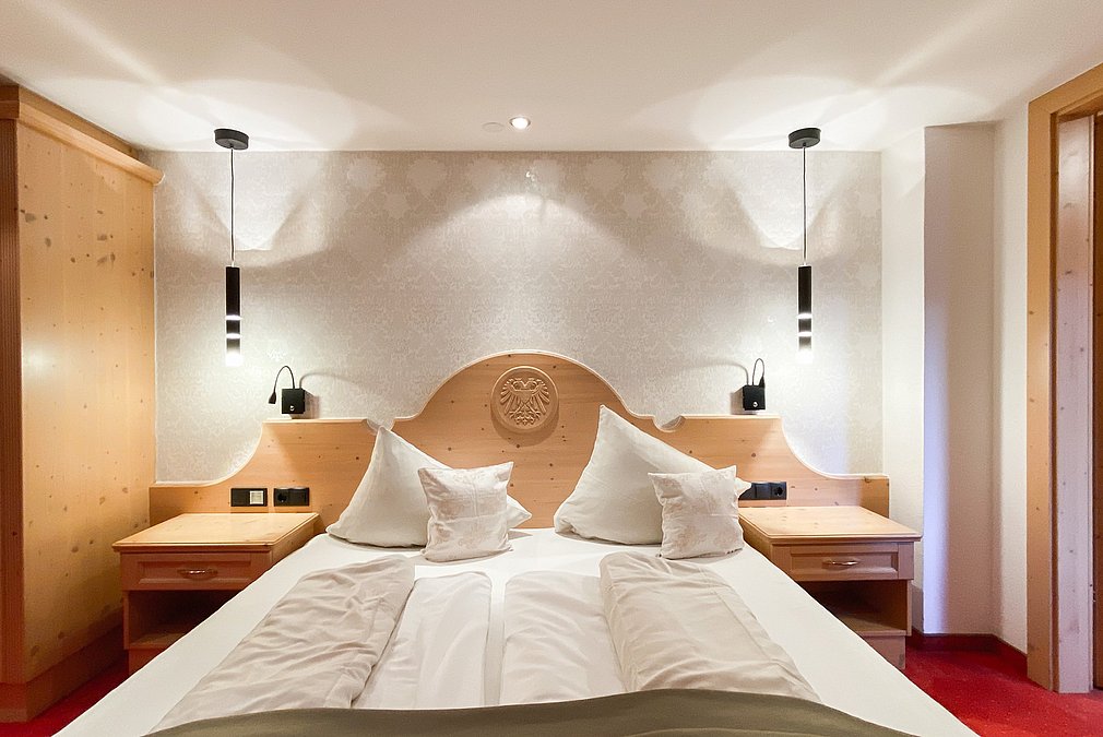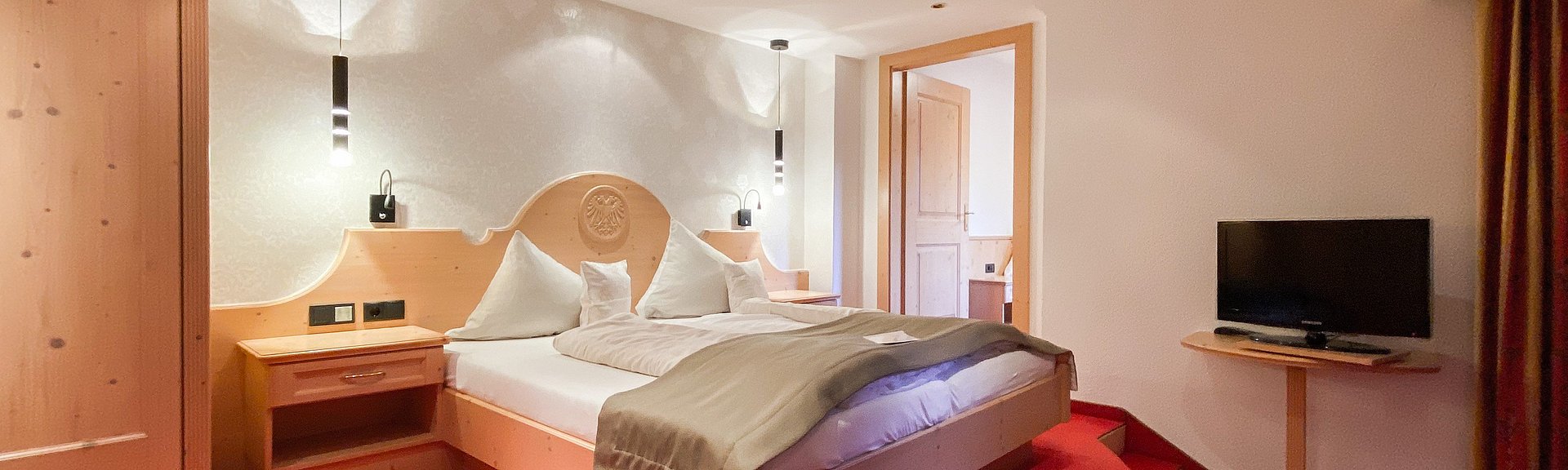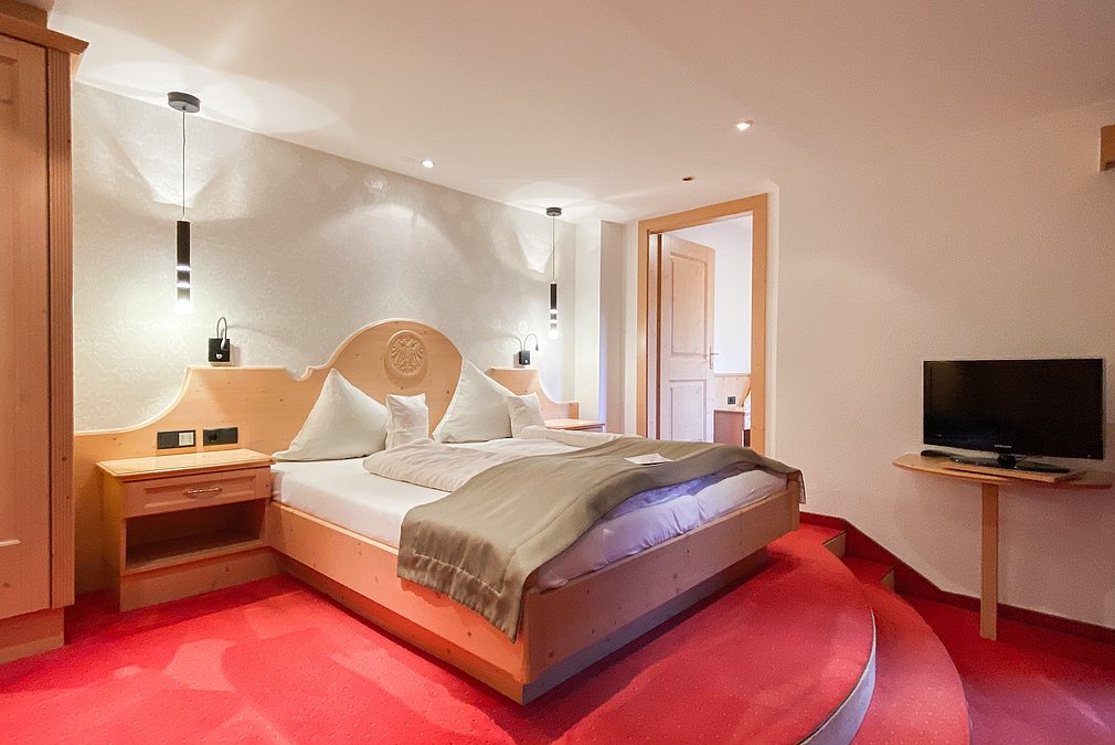 Double room with a small single room (Sat-TV, wardrobe), double couch, seating area, Sat-TV, radio, room safe, and balcony with mountain view. Bathroom with bathtub/shower, WC, hairdryer.