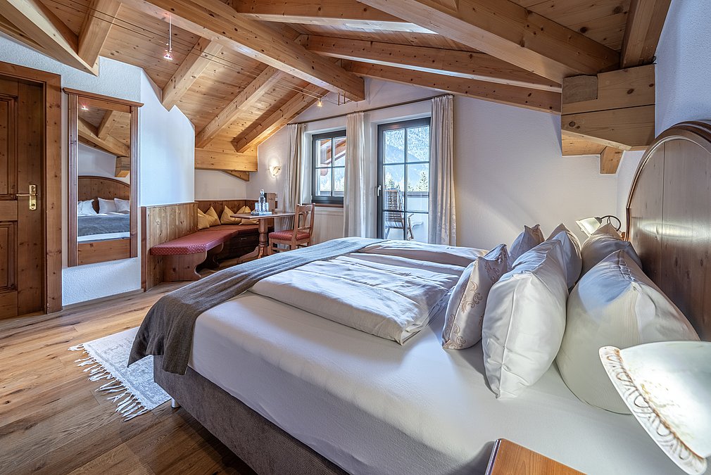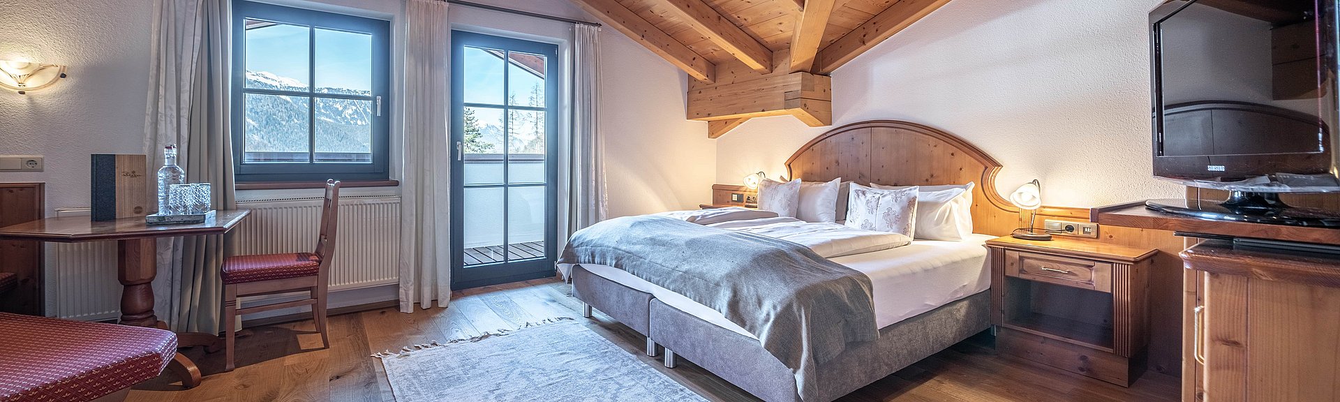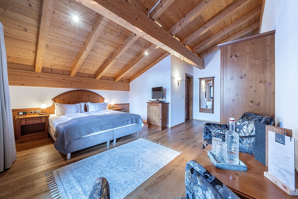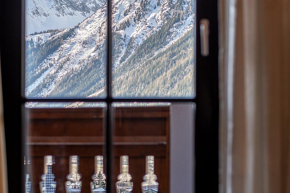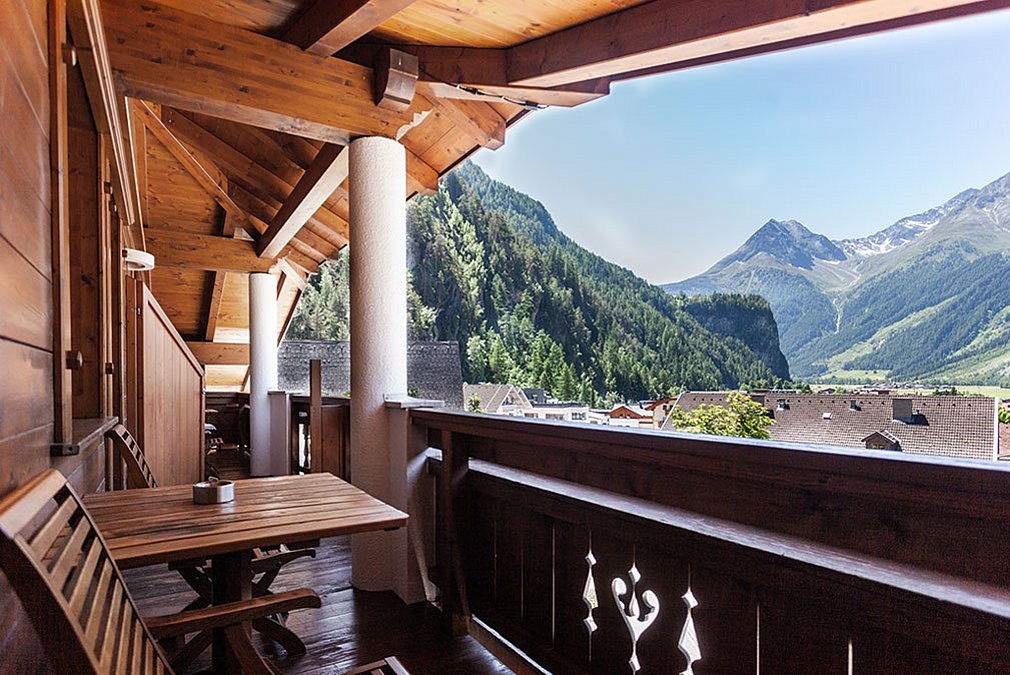 Panoramazimmer im Tiroler Stil mit Blick auf die Ötztaler Berge..Mit sichtbarem Holzdachstuhl, Dusche, WC, Föhn, Bademänteln, Sauna- & Badetüchern, Safe, Flachbild-TV, Radio, und Balkon mit Sonnenuntergang.