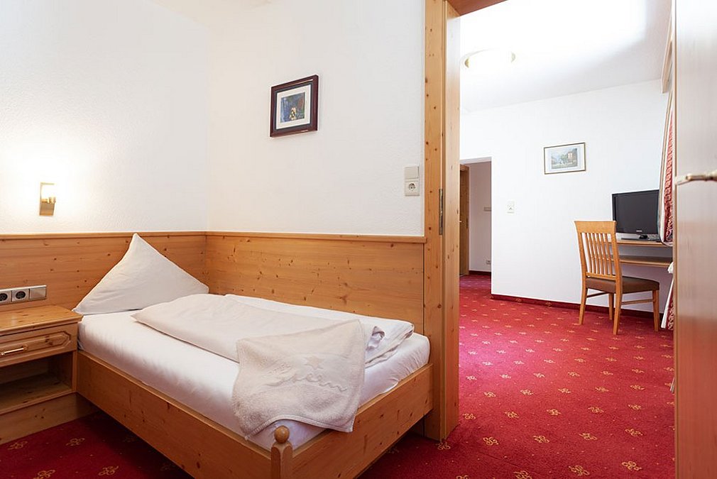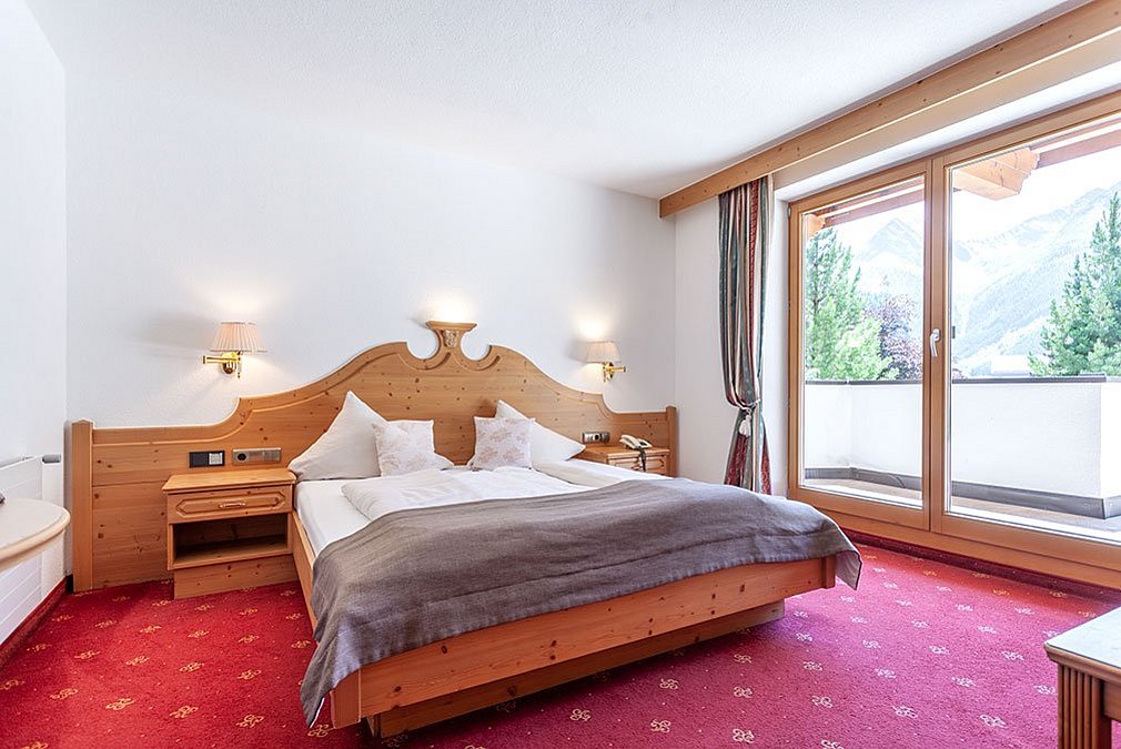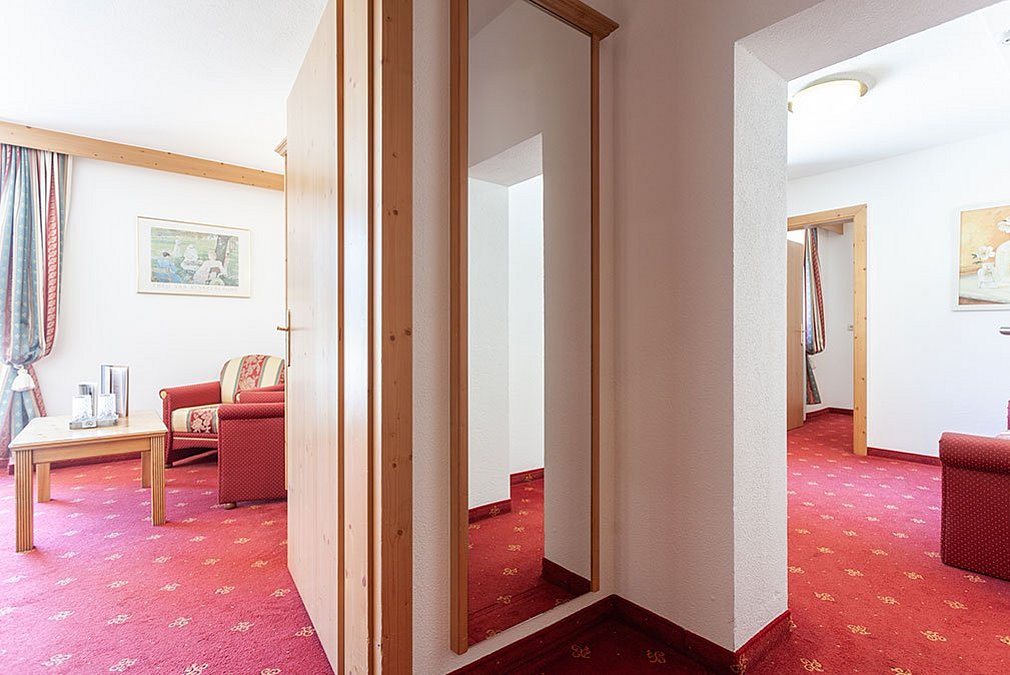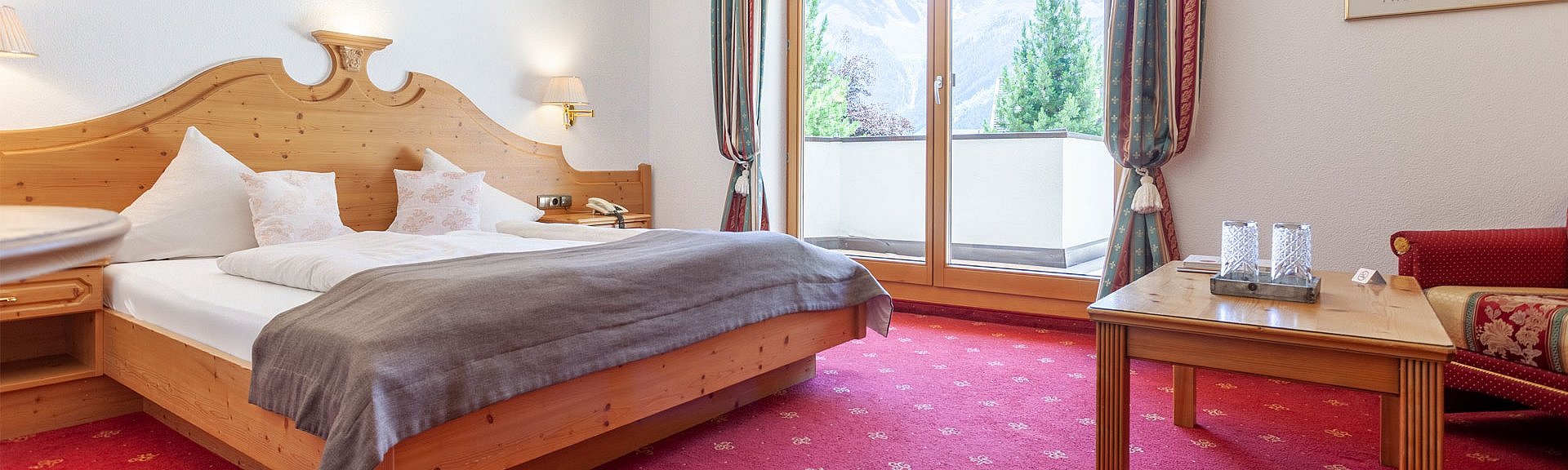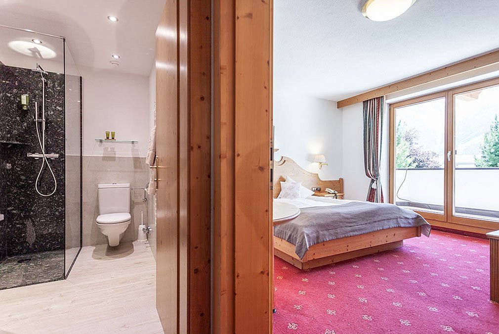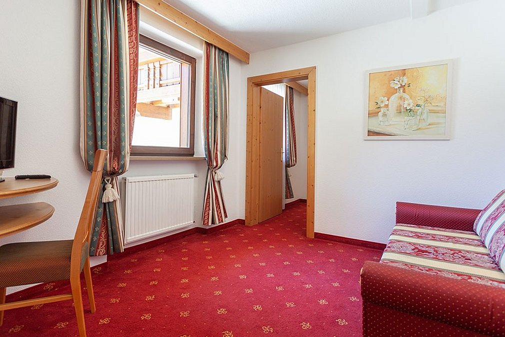 Modern-rustikales Zimmer mit Doppelbett, Sitzecke, Sat-TV, Telefon, Radio und Balkon mit Blick auf die Ötztaler Berge. Separates Wohnzimmer (auch als Schlafbereich nutzbar) und Einzelzimmer. Badezimmer mit Badewanne Föhn und WC.