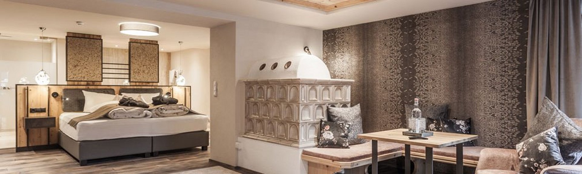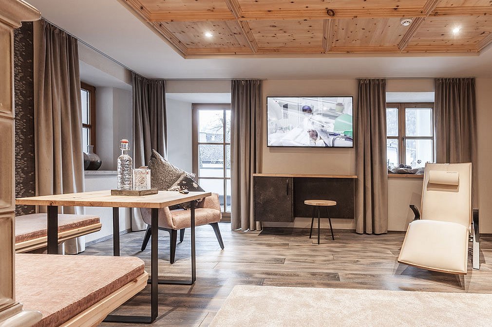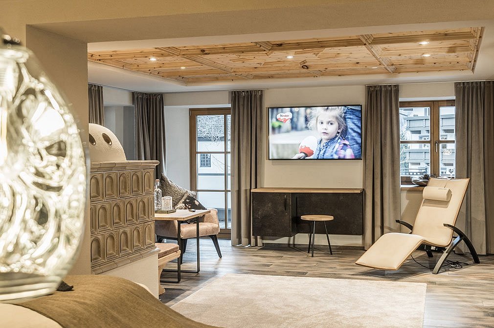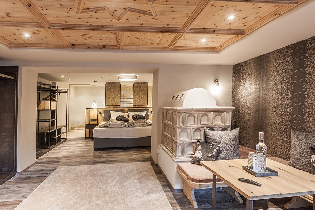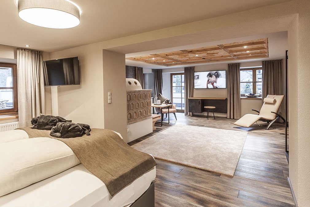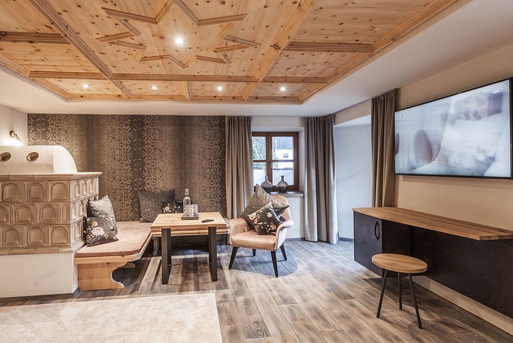 Moderne Romantik-Suite mit Original-Kachelofen, gemütlicher Sitzecke und Wellnessliege.