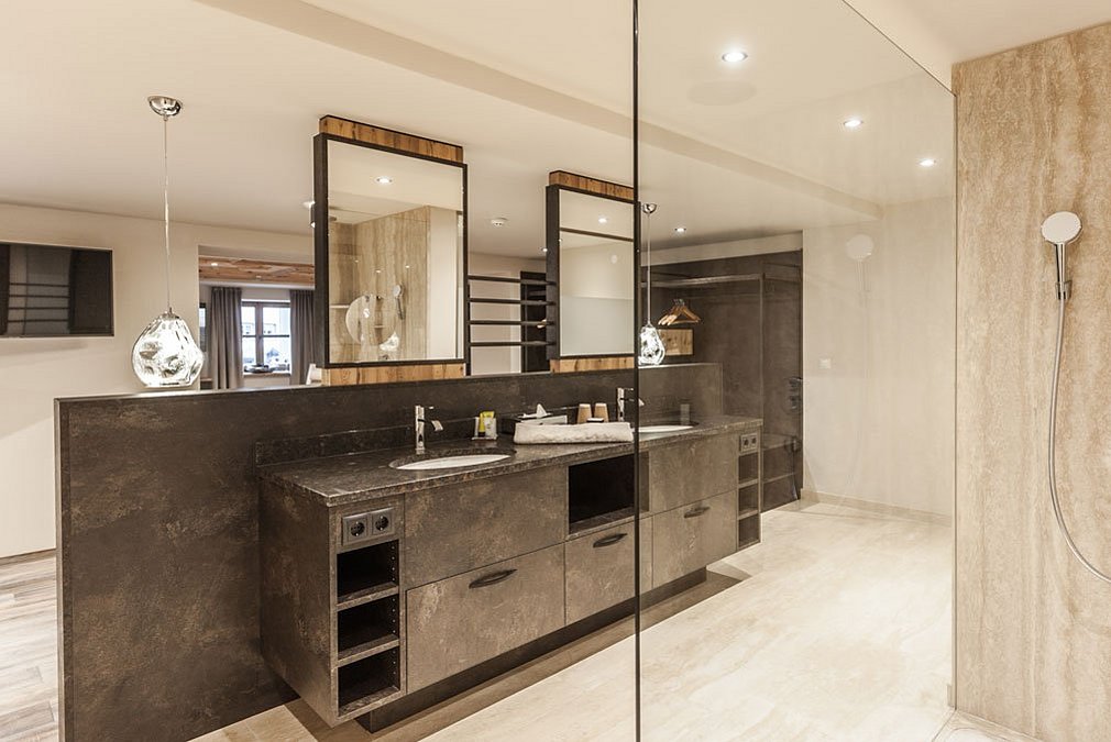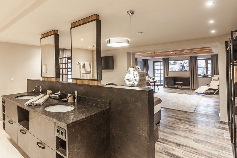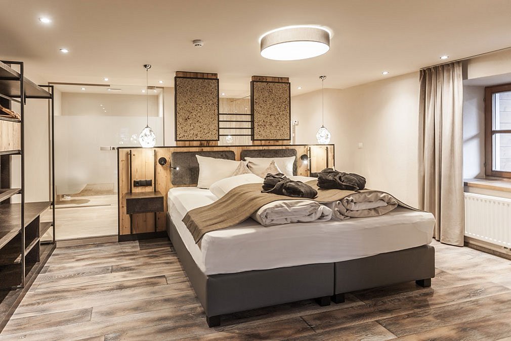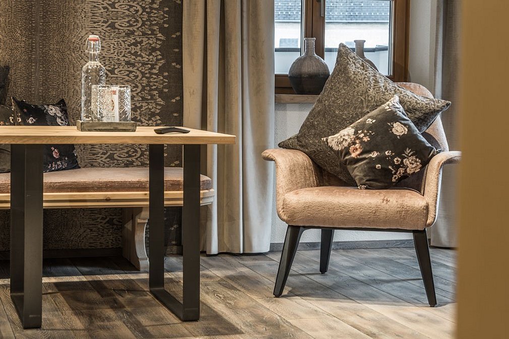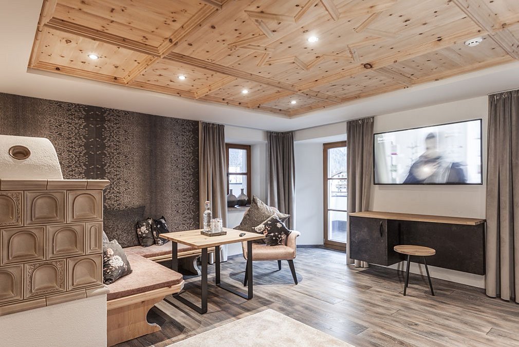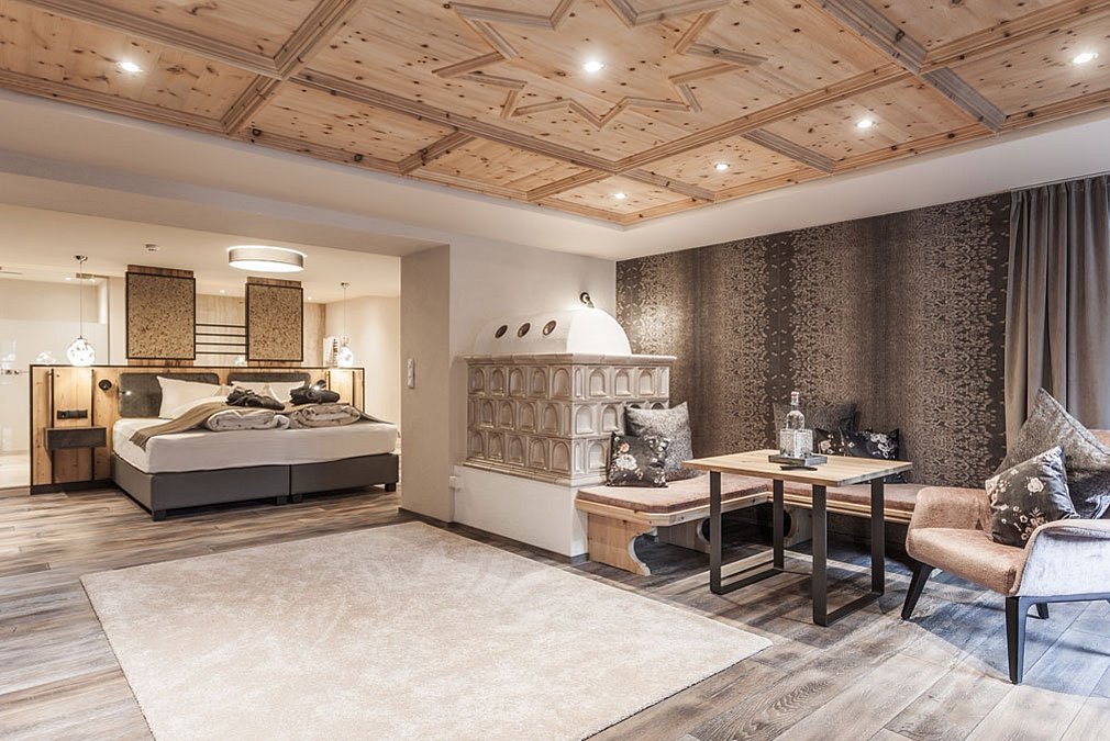 Moderne Romantik-Suite mit Original-Kachelofen, gemütlicher Sitzecke und Wellnessliege.